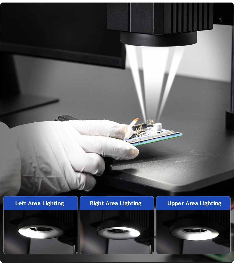 By illuminating the surface from different directions, it creates an angled stereo view, used to detect subtle scratches, bumps, surface printing, and other details that are difficult to see. A built-in control panel allows for independent control of the brightness of different areas.