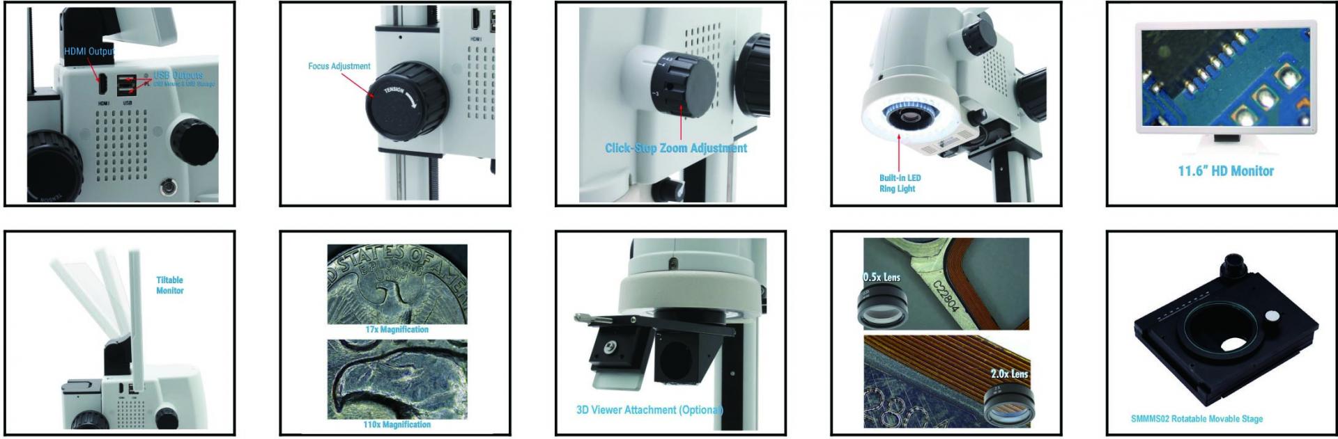 17x – 110x magnification (on the built-in 11.6″ monitor) without optional lenses