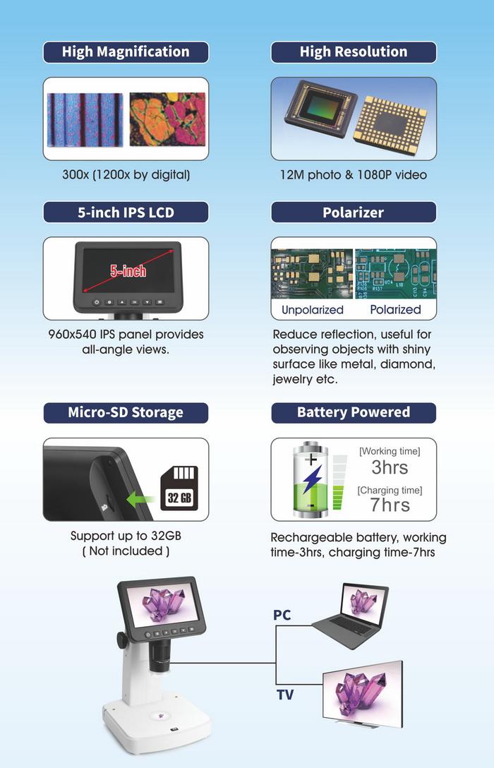 HPDM5 Digital Microscope with Polarizer, with 5-inch LCD Display